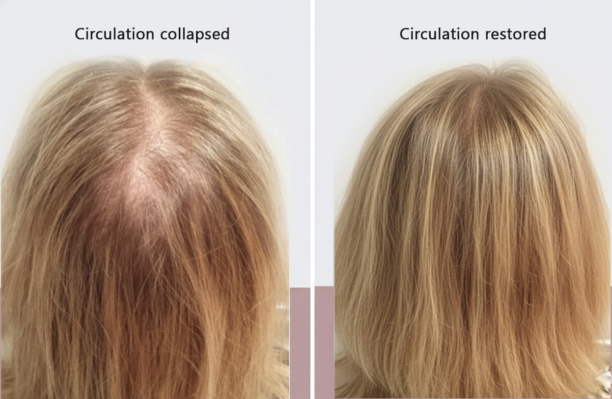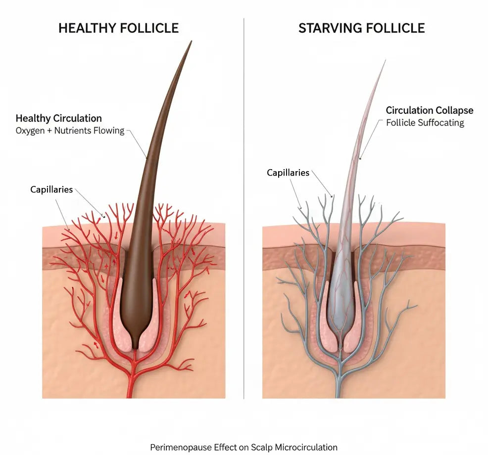 As estrogen drops during perimenopause, the microscopic blood vessels feeding each hair follicle start to collapse. These tiny capillaries—your roots' lifelines—shrink and "die off," cutting oxygen and nutrients to follicles.