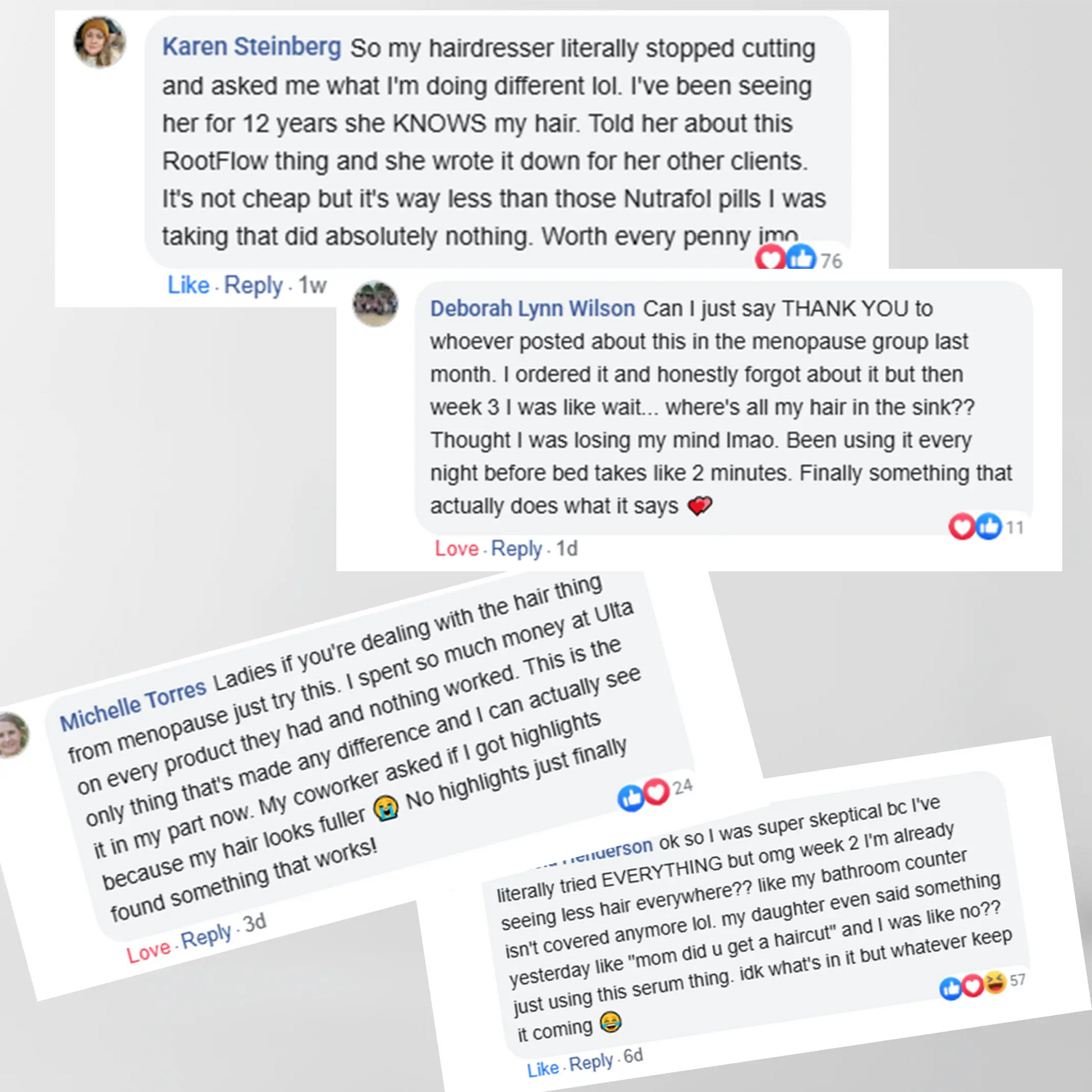 My whole life I had THICK hair. Like annoying thick. I used to shave half of it off because it was so much. Fast forward to last year and within 8 months it was just... gone? When I'd put it in a braid it felt like NOTHING. I spent $500 on Nutrafol. Six months. NOTHING. Week 3 with RootFlow I was like "wait... where's all the hair?" My drain was basically clear. Month 2 my hairdresser (who's seen me for 15 years) literally stopped and said "what are you doing differently?" and I CRIED. My part doesn't look like a landing strip anymore. I can sit by windows again. If you're on the fence just try it.